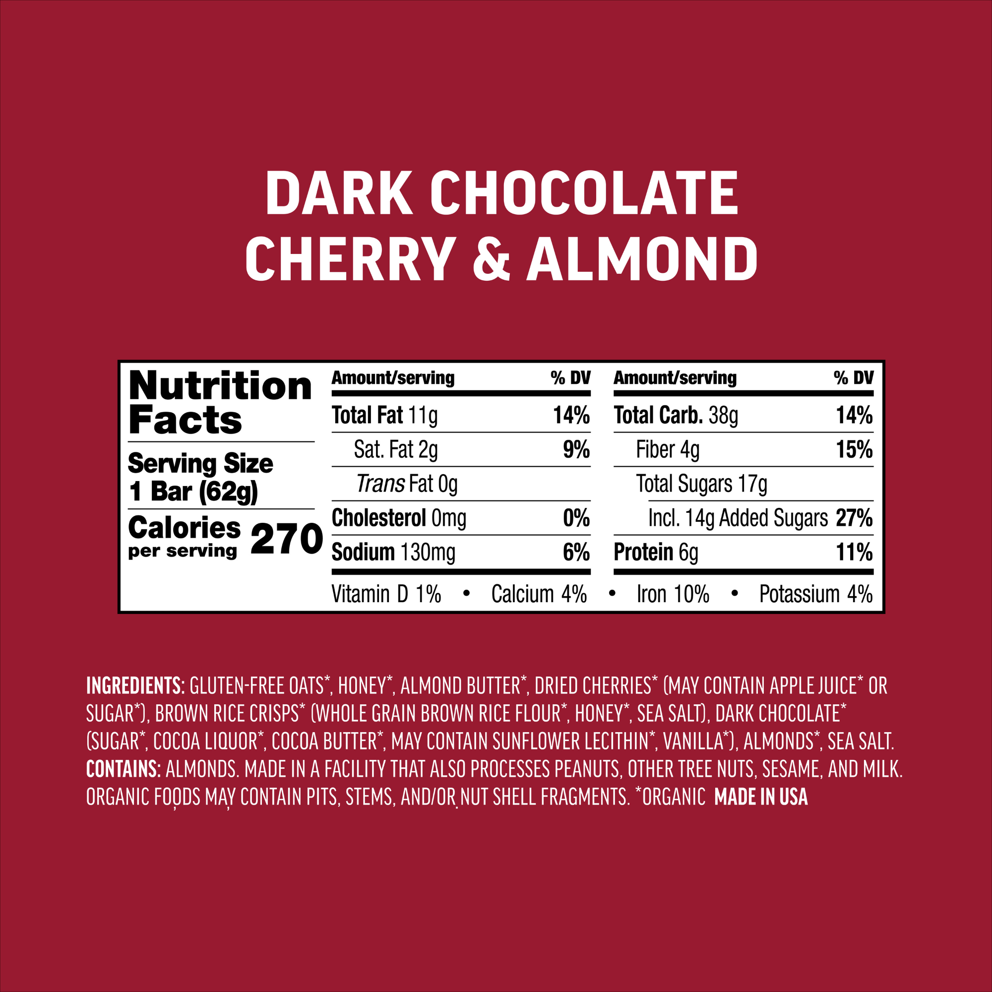 Elevate your snacking with our chocolate cherry bars, crafted from a blend of rich dark chocolate, tart dried cherries, and crunchy almonds. These bars are made with organic, whole food ingredients, like antioxidant-packed cherries, protein-rich almonds, and True Source Certified honey, offering the perfect balance of flavor and function.