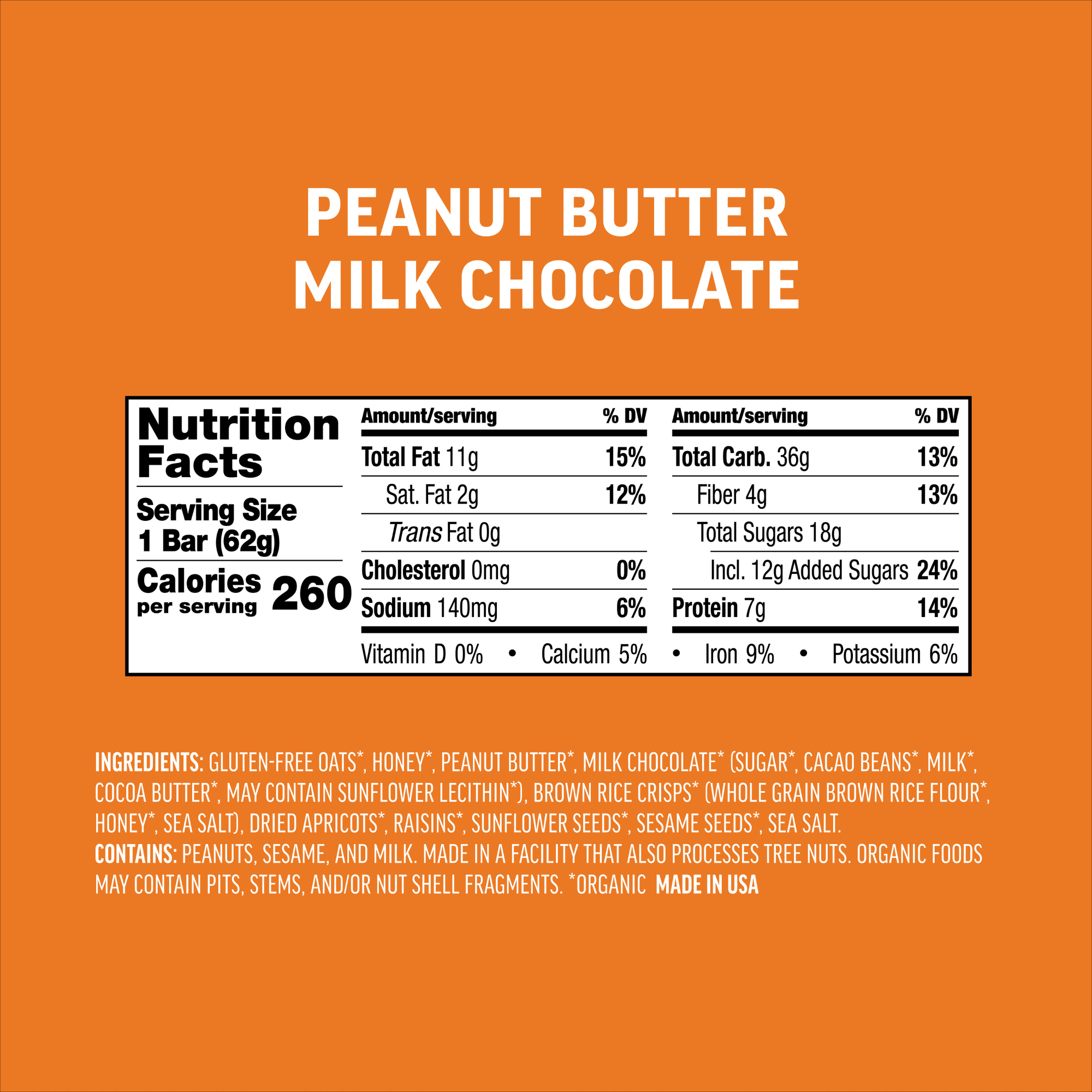 Our chocolate peanut butter granola bars are a delicious blend of creamy peanut butter, smooth milk chocolate, and wholesome organic ingredients. Each bar is made with real dried fruits like raisins and apricots, plus nutrient-dense seeds and certified gluten-free oats to create a snack that’s both indulgent and nourishing.